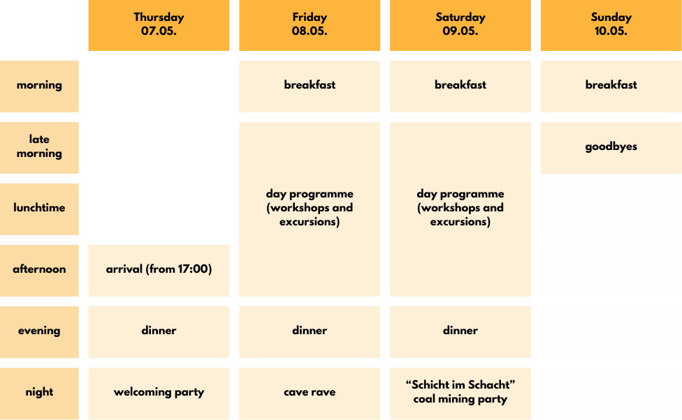 It offers plenty of space, a large kitchen, and a beautiful vaulted cellar (“Gewölbekeller”) for our activities. There are 24 beds available (4 dorm rooms with 6 beds each), as well as space on the campsite. When you register, please let us know whether you would be happy to camp or if you would prefer to attend only if a bed is available. This will help us plan accommodation as smoothly as possible. 🙂