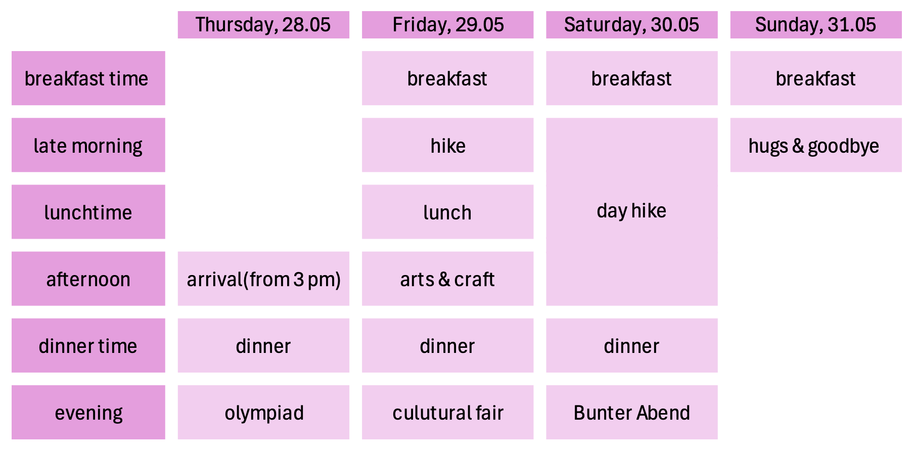 We will decide on the exact hike depending on the day and mood, so that everyone will have fun!